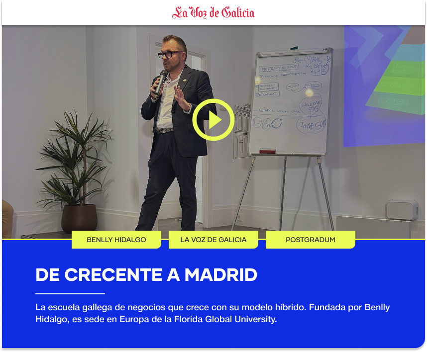 Como CEO de Postgradum University, Benlly Hidalgo ha liderado su crecimiento desde el primer acuerdo fundacional con AMIR–UDIMA hasta convertirla en el Hub Académico Oficial en España del Grupo Florida Global University.
