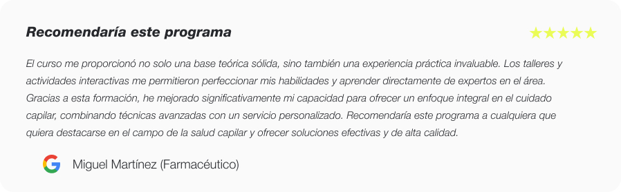 Durante el programa, María recibió una formación exhaustiva, diseñada para cubrir desde la fisiología del cuero cabelludo hasta la formulación de productos y el diseño de tratamientos personalizados. Gracias a los talleres prácticos y el enfoque estructurado del equipo de Postgradum Salud, pudo aplicar los conocimientos adquiridos en casos reales, desarrollando una sólida confianza en sus habilidades.